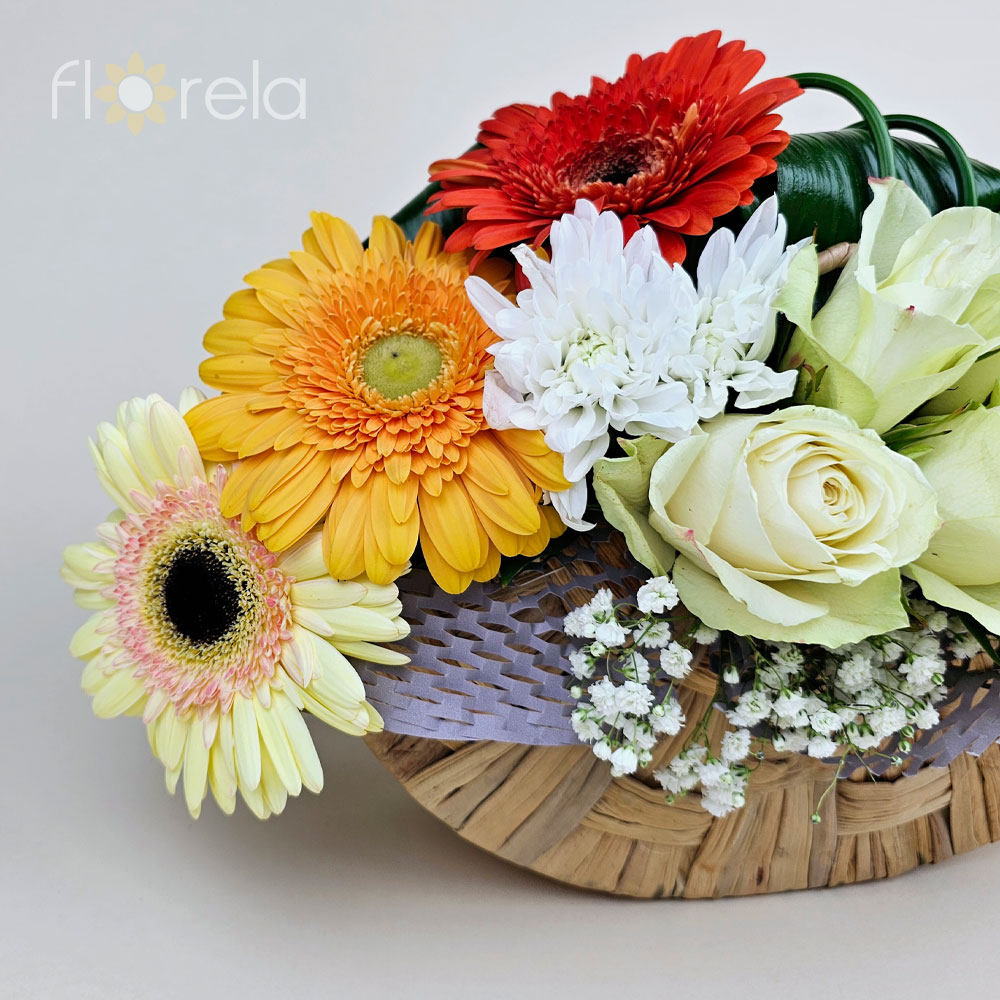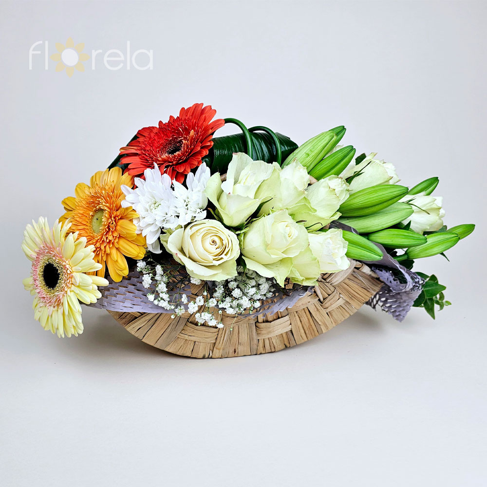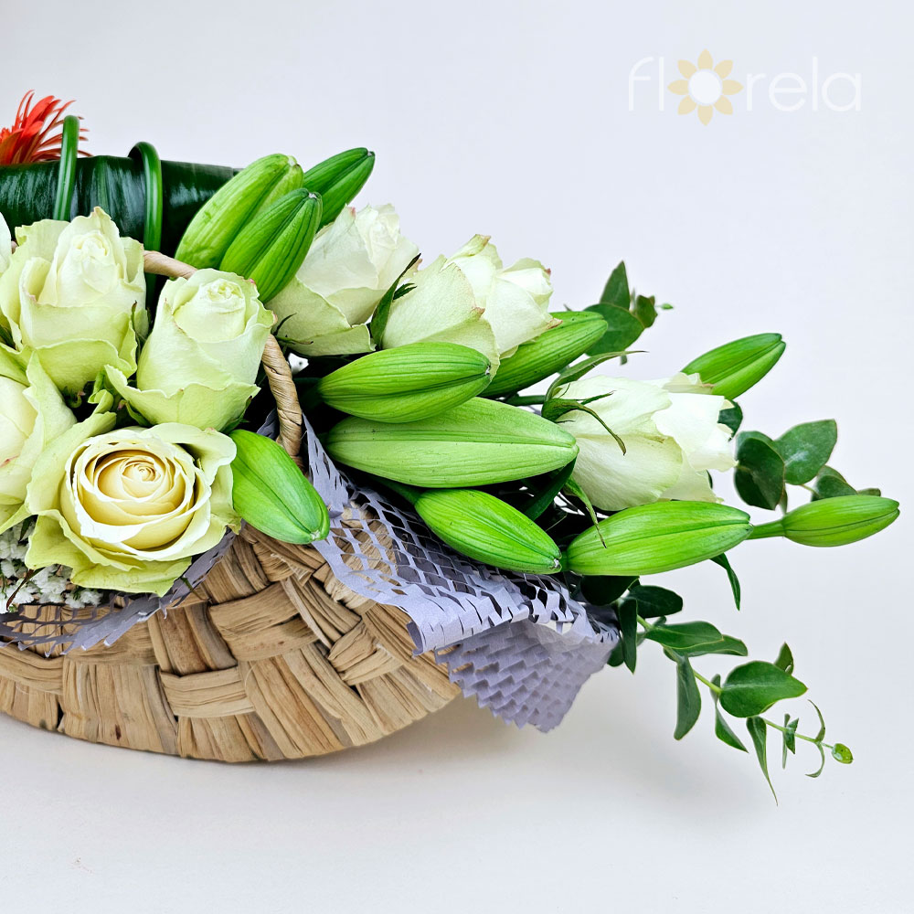 Ovalna korpa raskošnog, ali profinjenog izgleda ujedinjuje gerbere, ruže i ljiljane u sklad boja i mirisa koji osvajaju na prvi pogled. Svaki cvet nežno se nadovezuje na sledeći, dok eukaliptus unosi svežinu i suptilan, prirodan miris. Aranžman odiše elegancijom i originalnošću — savršen izbor za poklon koji govori više od reči, za trenutke kada želite da ostavite utisak stila, pažnje i topline.