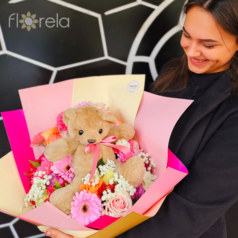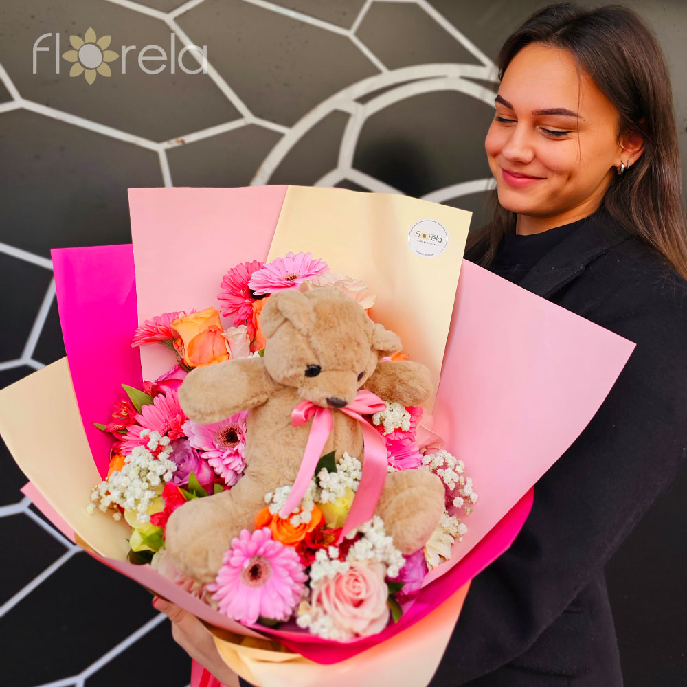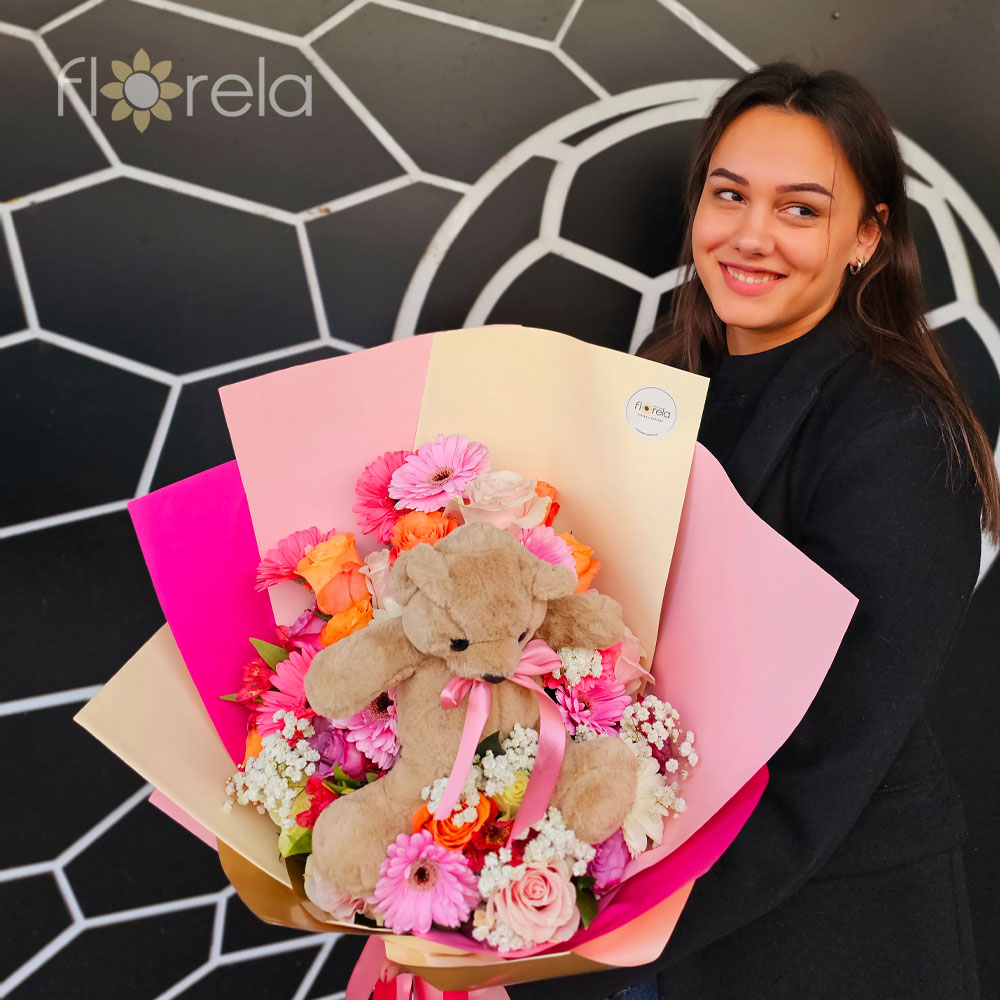 Neodoljiv buket u kome se plišani meda nežno ušuškao među raskošne ruže, razigrane gerbere i nežnu gipsofilu, sve je pažljivo obavijeno pastelnim papirom koji dodatno naglašava toplinu i romantiku kompozicije.