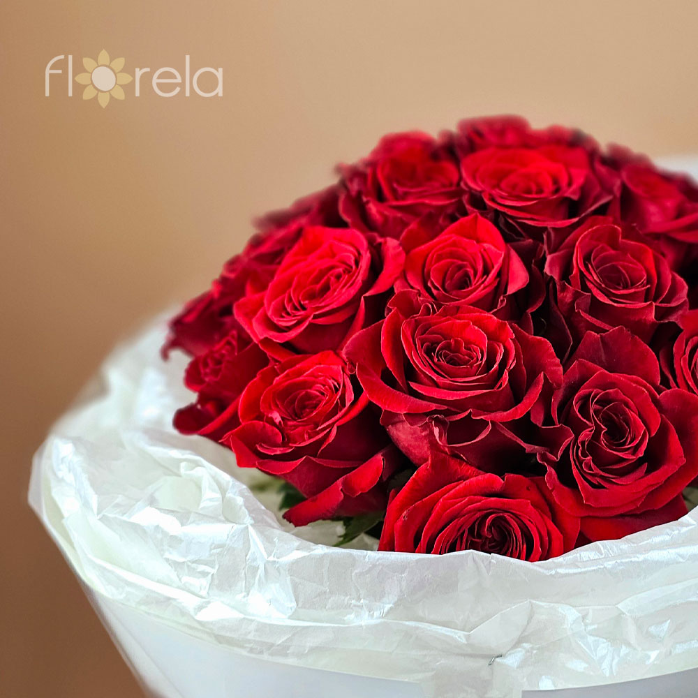 Buket rubin romansa – 25 raskošnih crvenih ruža pažljivo složenih u savršenu formu, obavijenih elegantnim belim penastim papirom koji dodatno ističe njihovu duboku boju i snagu poruke.